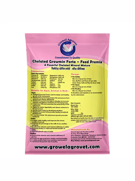 Benefits of Chelated Growmin Forte Feed Premix (Chelated Minerals & Mixture) for Pig and Swine: Chelated Growmin Forte Feed Premix (Chelated Minerals & Mixture) improves fertility and reproductive performance in the pig. Chelated Growmin Forte Feed Premix (Chelated Minerals & Mixture) improves the pig's immune system. Chelated Growmin Forte Feed Premix (Chelated Minerals & Mixture) reduces carcass and bone abnormalities in a pig. Chelated Growmin Forte Feed Premix (Chelated Minerals & Mixture) overcome stress and disease resistance in pigs. Composition: Each 1 kg. contains