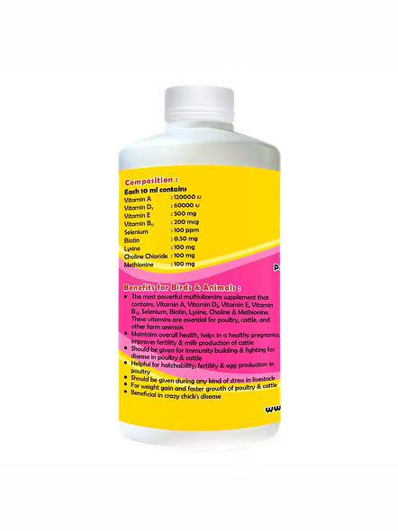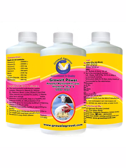 Multivitamins (Growvit Power) is a powerful multivitamins supplement that contains Vitamin A, Vitamin D3, Vitamin E, Vitamin B12, Selenium, Biotin, Lysine, Choline & Methionine. These vitamins are essential for pigs.